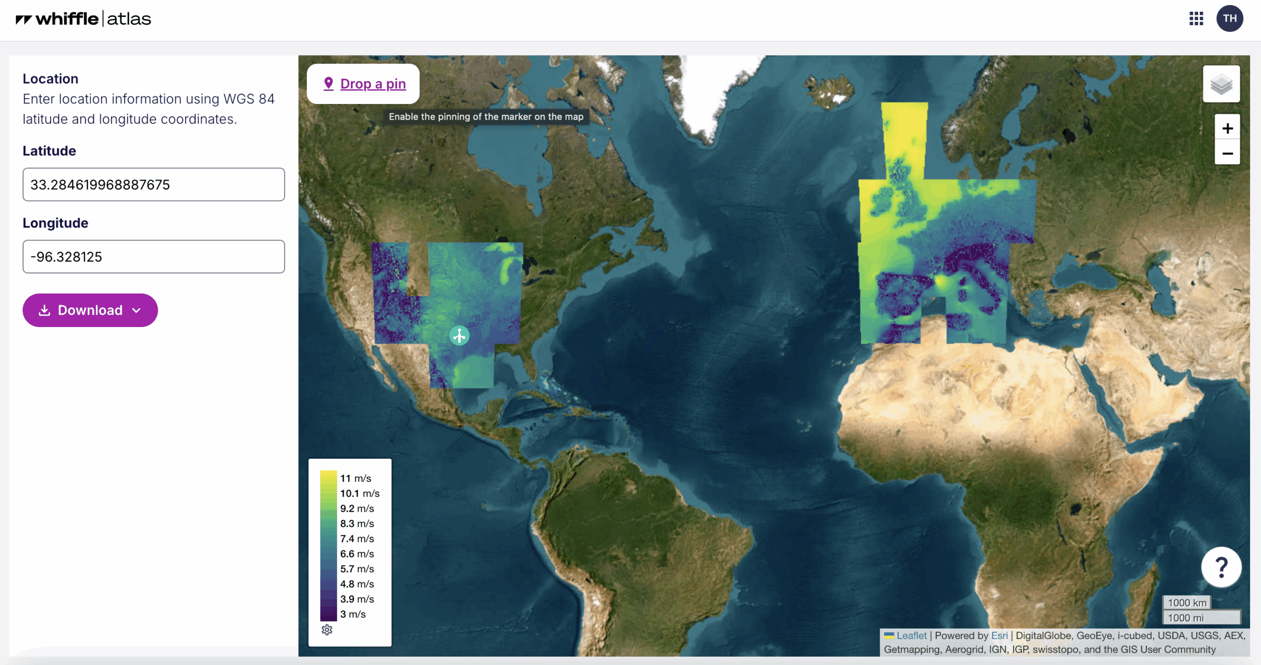 Whiffle Atlas provides finer spatial resolution (2 km) and more height granularity (10 fixed levels from 2 to 500 m) than ERA5 or GWA, making it more representative at project scale. Unlike raw reanalysis, Atlas is precomputed, directly downloadable, and validated against over 300 met masts globally.