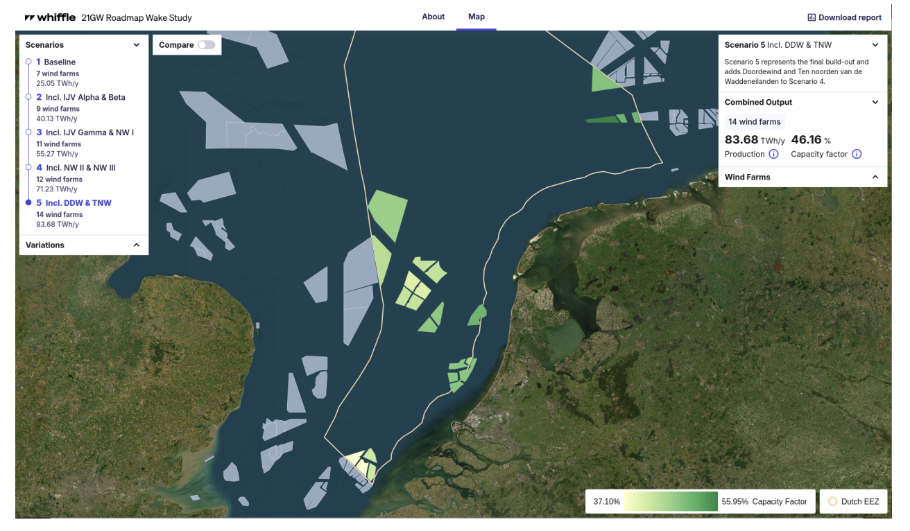 Whiffle’s LES was used to model the full Dutch 21 GW offshore wind roadmap, delivering annual energy production estimates and detailed insight into farm-to-farm wake and blockage effects.