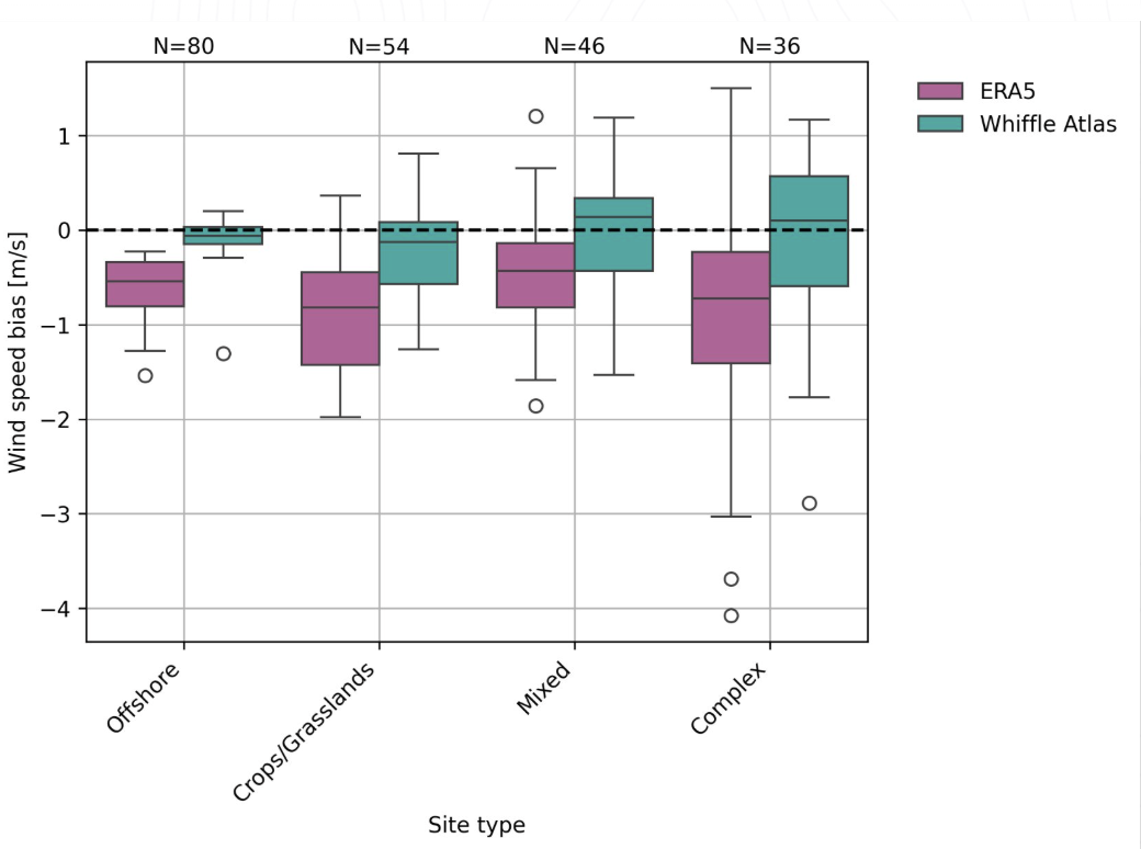 Whiffle Atlas achieves a near-zero mean wind speed bias of –0.09 m/s across 108 sites — compared to –0.706 m/s for ERA5 — with tighter scatter and less systematic underestimation across all terrain types.